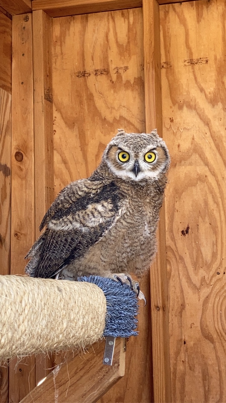 One spring morning, we received a call about two young great horned owls that had fallen from their nest high in a tree. The nest had been dislodged by strong winds during a storm the night before. Sadly, one of the owlets did not survive the fall. But miraculously, his sibling, though small, fluffed with down, and wide-eyed—was found alive, alert, and uninjured on the ground beneath the tree. With the nest too high and inaccessible to return him to, we took him in.